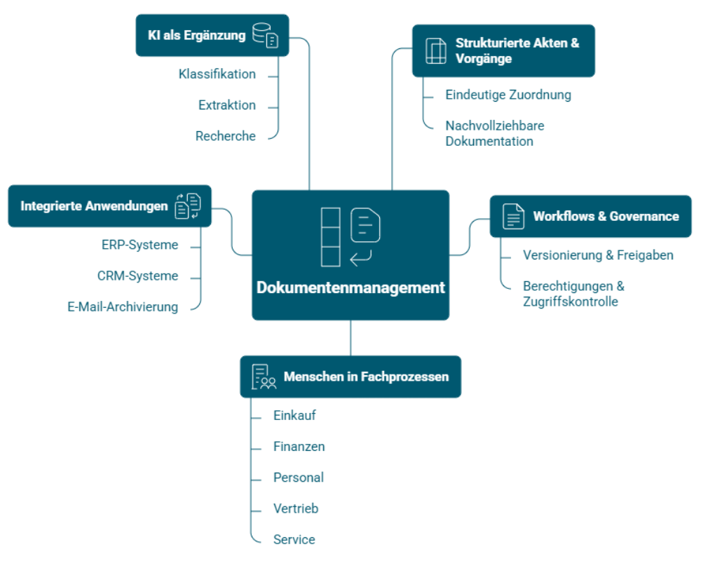 Der Mittelstand ist kein einheitliches Segment. In der Regel sprechen wir von Unternehmen mit rund 50 bis 500 Mitarbeitern und gewachsenen Prozessen in Einkauf, Finanzen, Personal, Vertrieb oder Service. Genau dort muss ein DMS ansetzen: Inhalte werden Vorgängen zugeordnet, Zuständigkeiten abgebildet und Dokumente im Kontext bereitgestellt. Wichtig sind dabei Integrationen in ERP, CRM und E-Mail-Archivierung, damit Informationen konsistent bleiben und DMS nicht als weiteres System neben der bestehenden Anwendungslandschaft betrieben wird.
